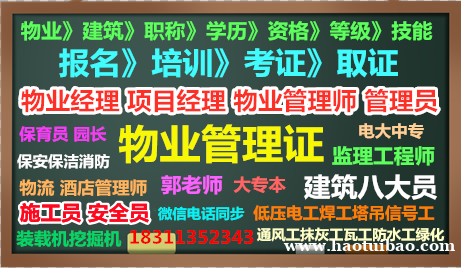 物业项目经理1400,物业经理1200,添加郭老师微信发证书样本、查询、报名条件、报名费用咨询报名流程和更多证书使用信息