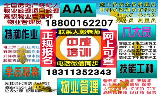 物业经理培训、物业管理师培训、物业项目经理培训、八大员培训、建筑八大员、施工员培训、预算员培训、质量员培训、安全员培训、材料员培训、机械员培训、测量员培训、资料员培训、监理员培训、、保育员培训、园长证培训、高低压电工、焊工、瓦工、木工、电梯管理,电梯司机,叉车司机,锅炉,物业管理员培训、物业部门经理培训、物业总经理培训等